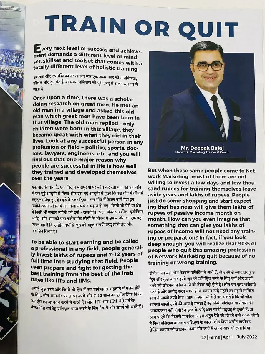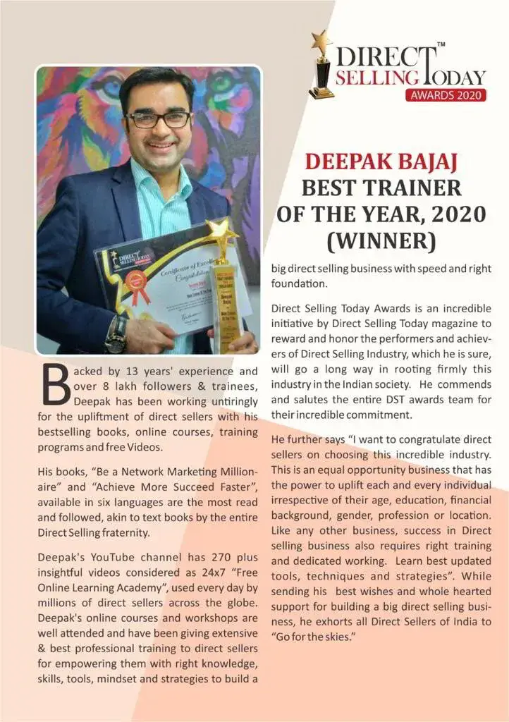 Deepak Bajaj is India's leading Direct Selling Expert. His work is showing people the way to change their life.